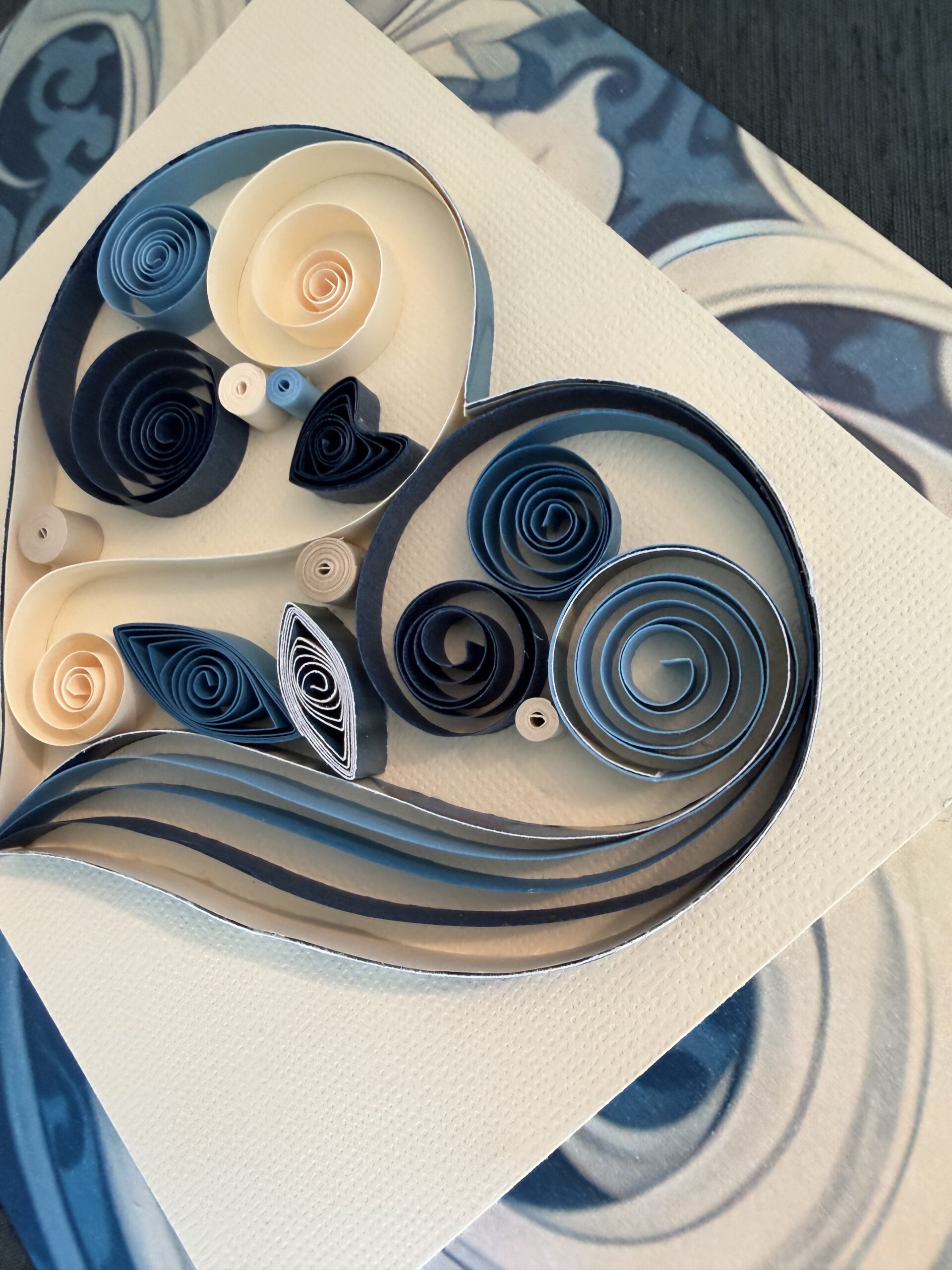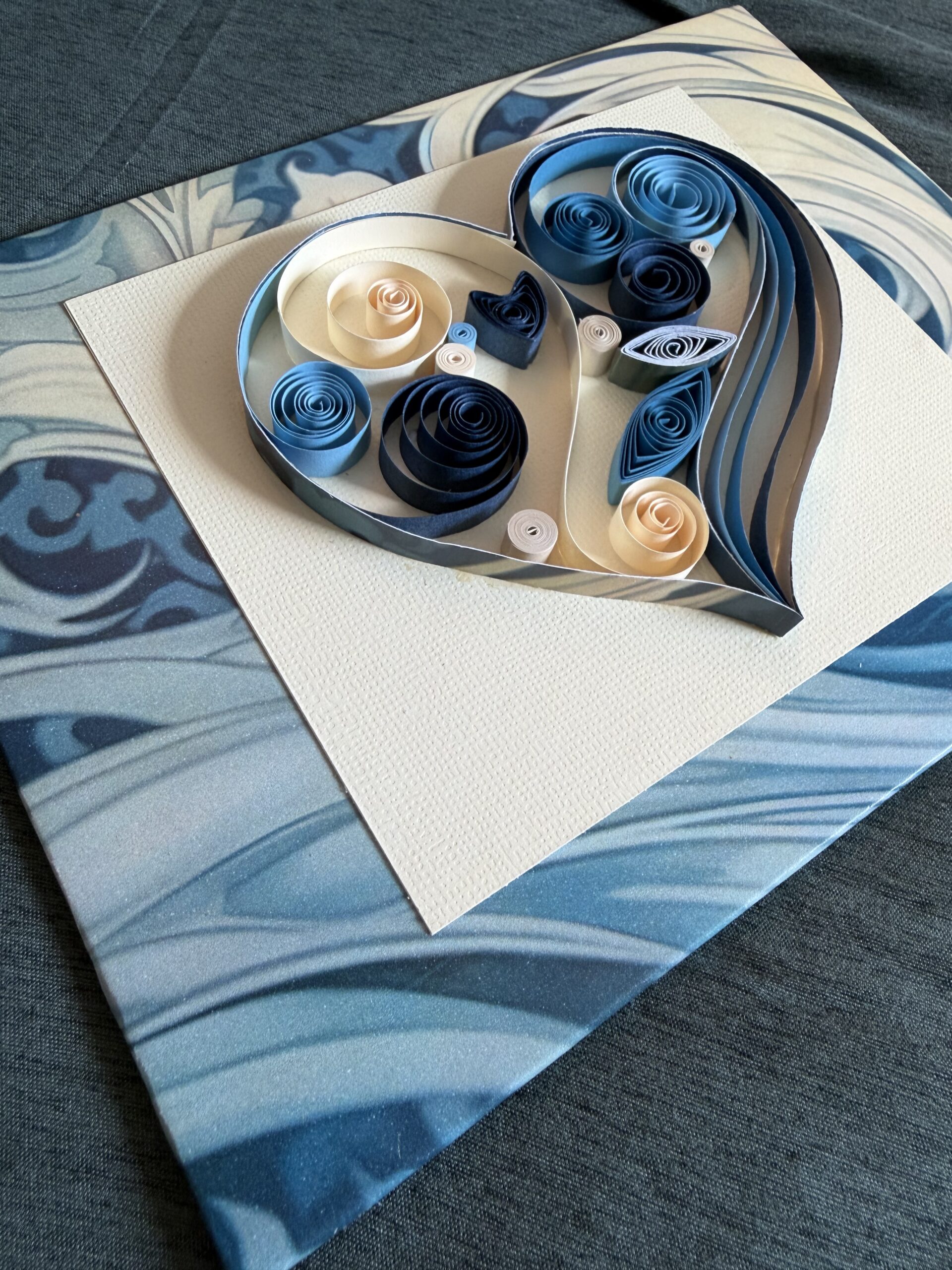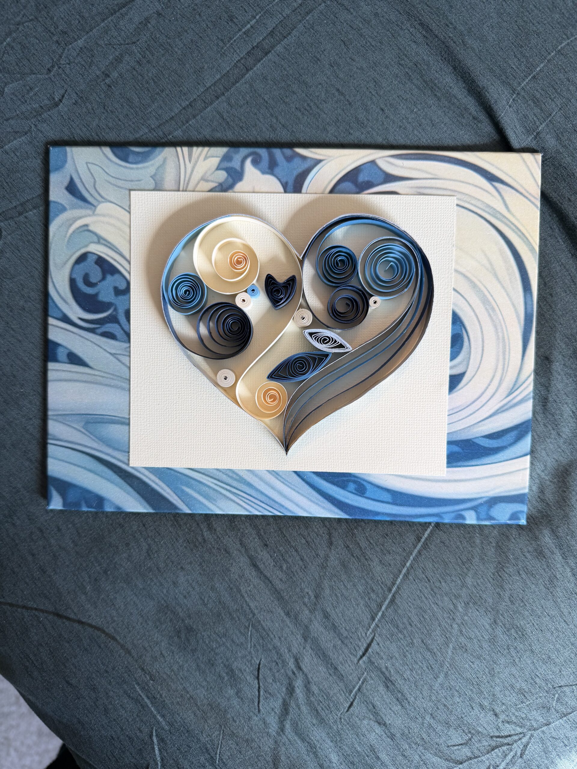 The heart sits on a plain beige piece of cardstock. The background paper is in shades of blues & creams.
