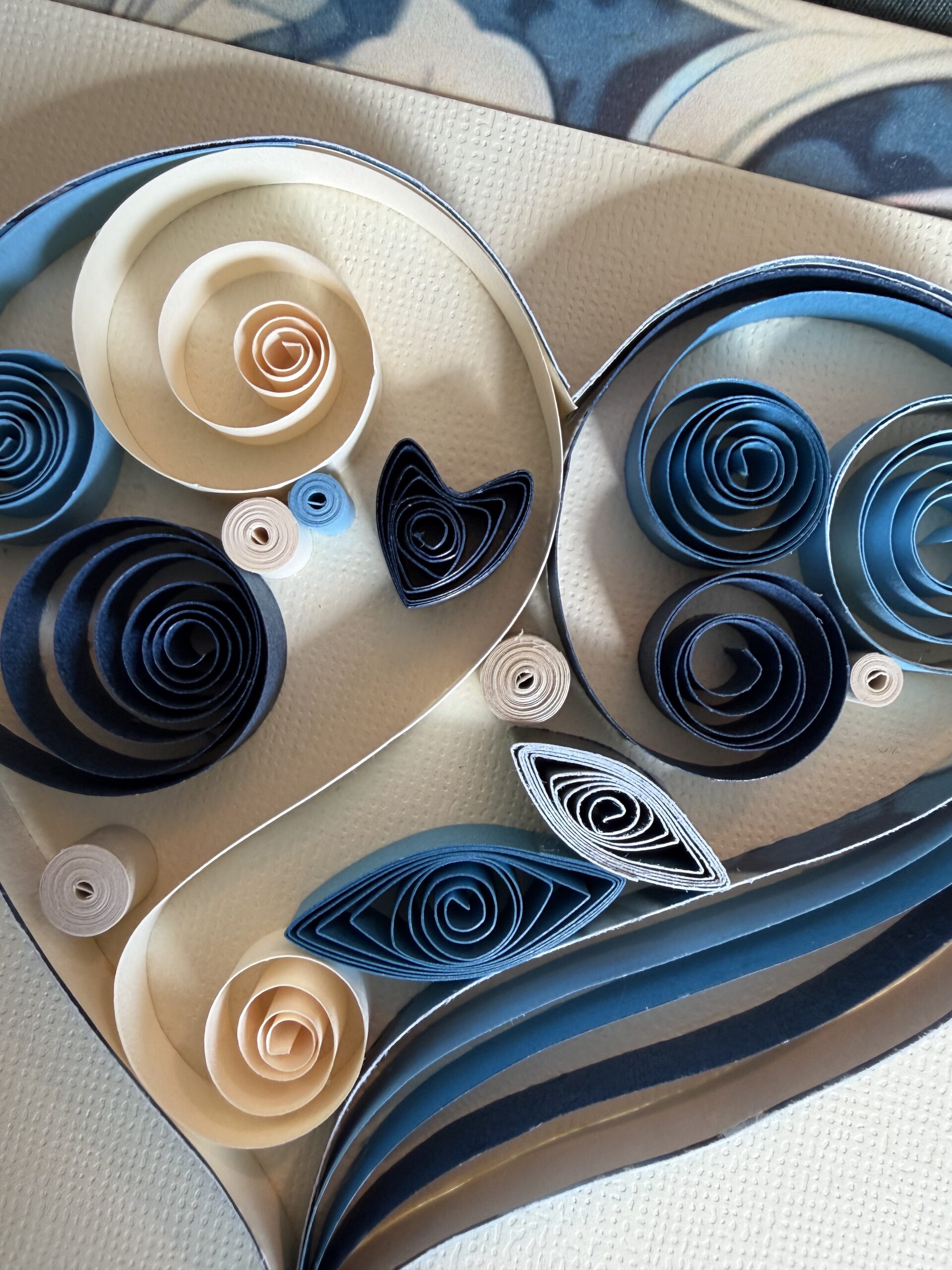 I used 7mm quilling strips in the shades of navy, champagne, beige, steel blue, and grey blue.