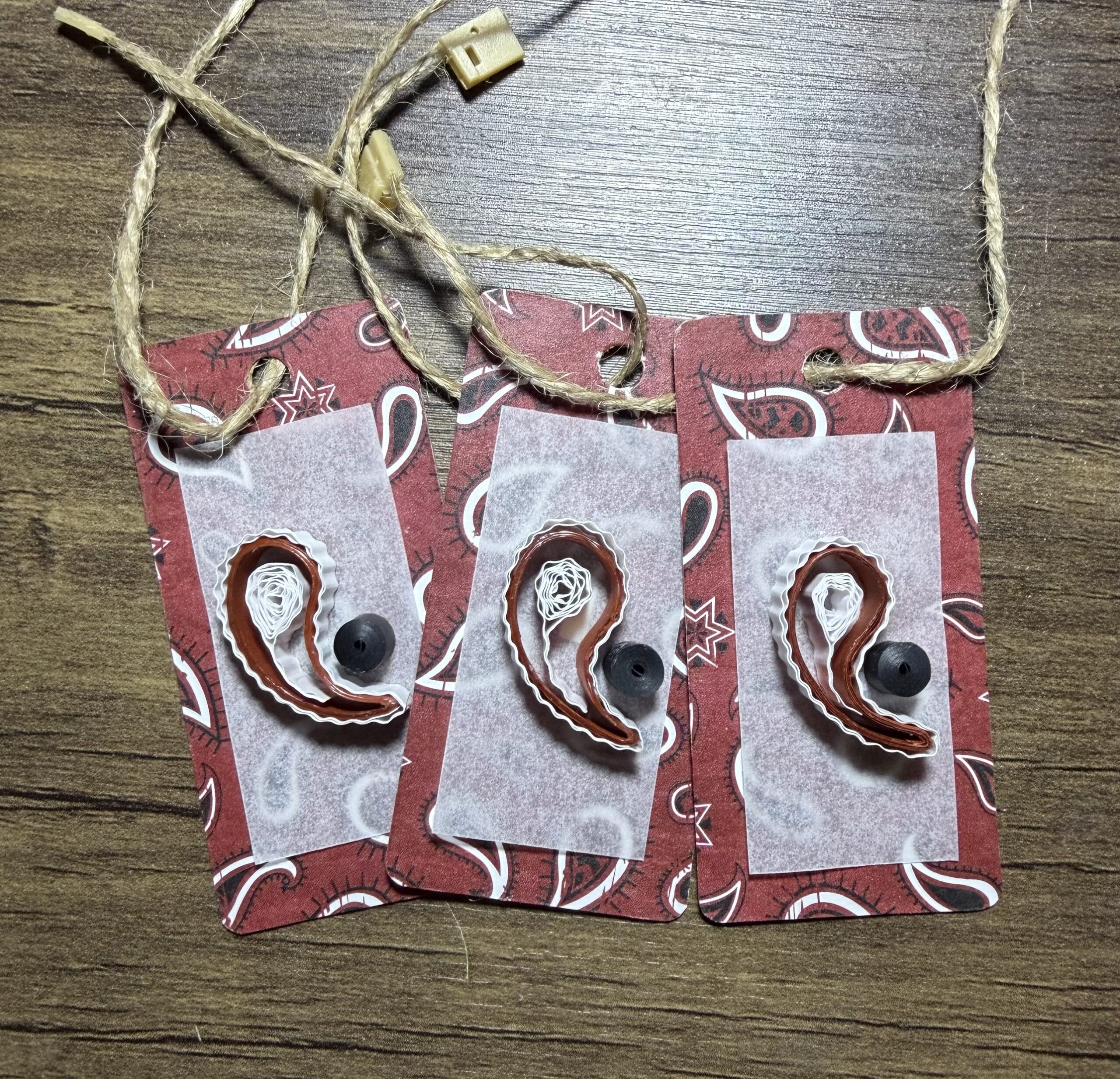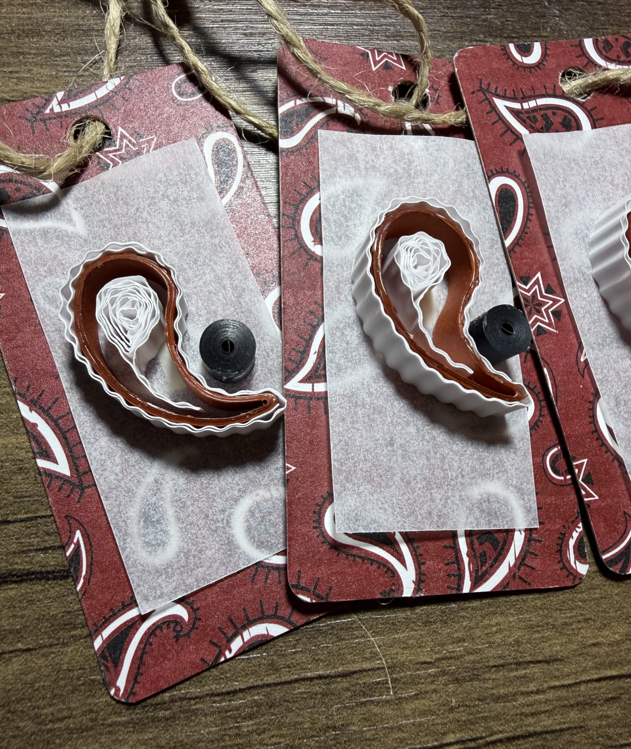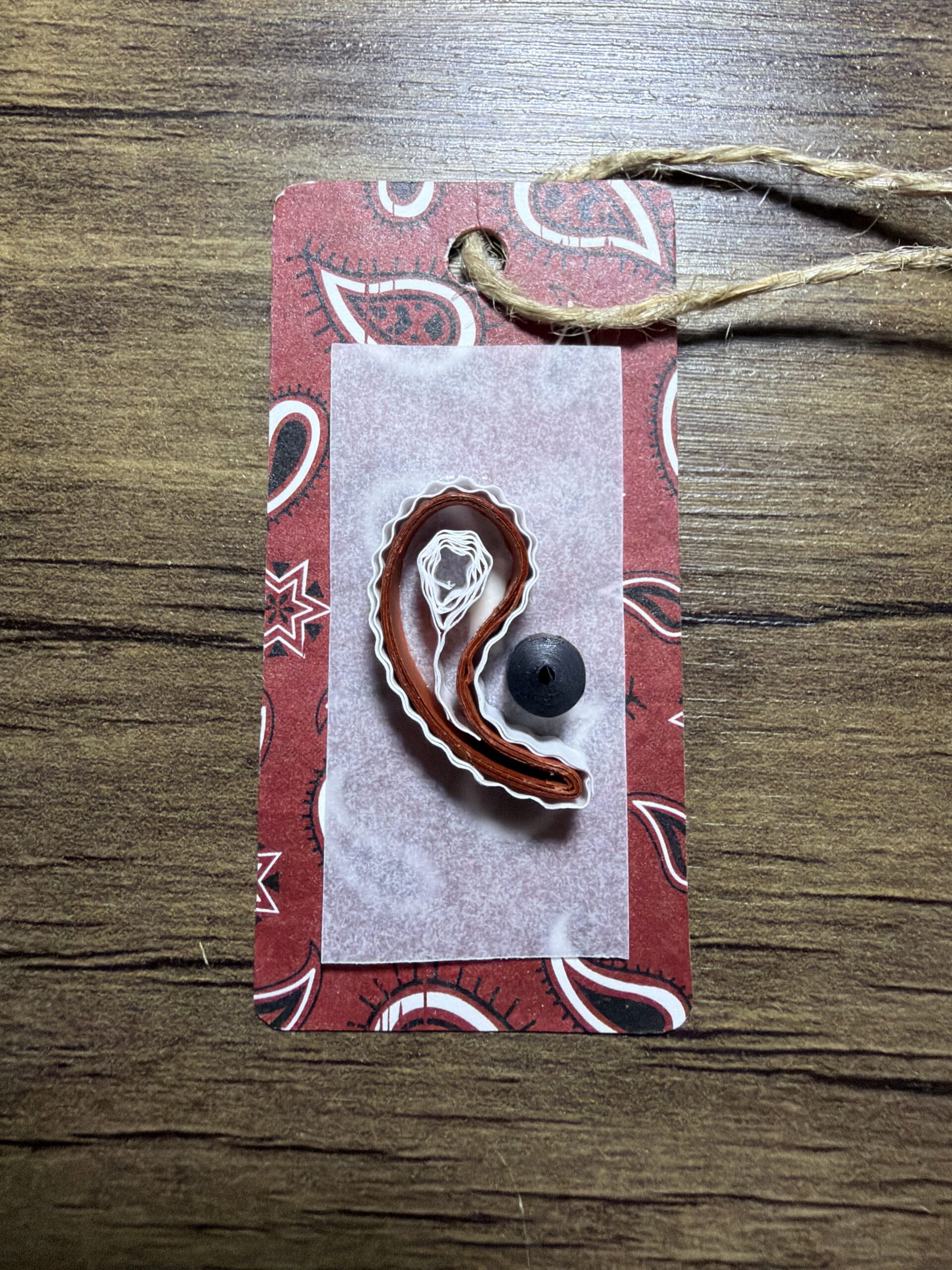 I used 7mm quilling strips in the shades of brick red, white, and black. Â I also used a paisley designed cardstock paper for the background.
