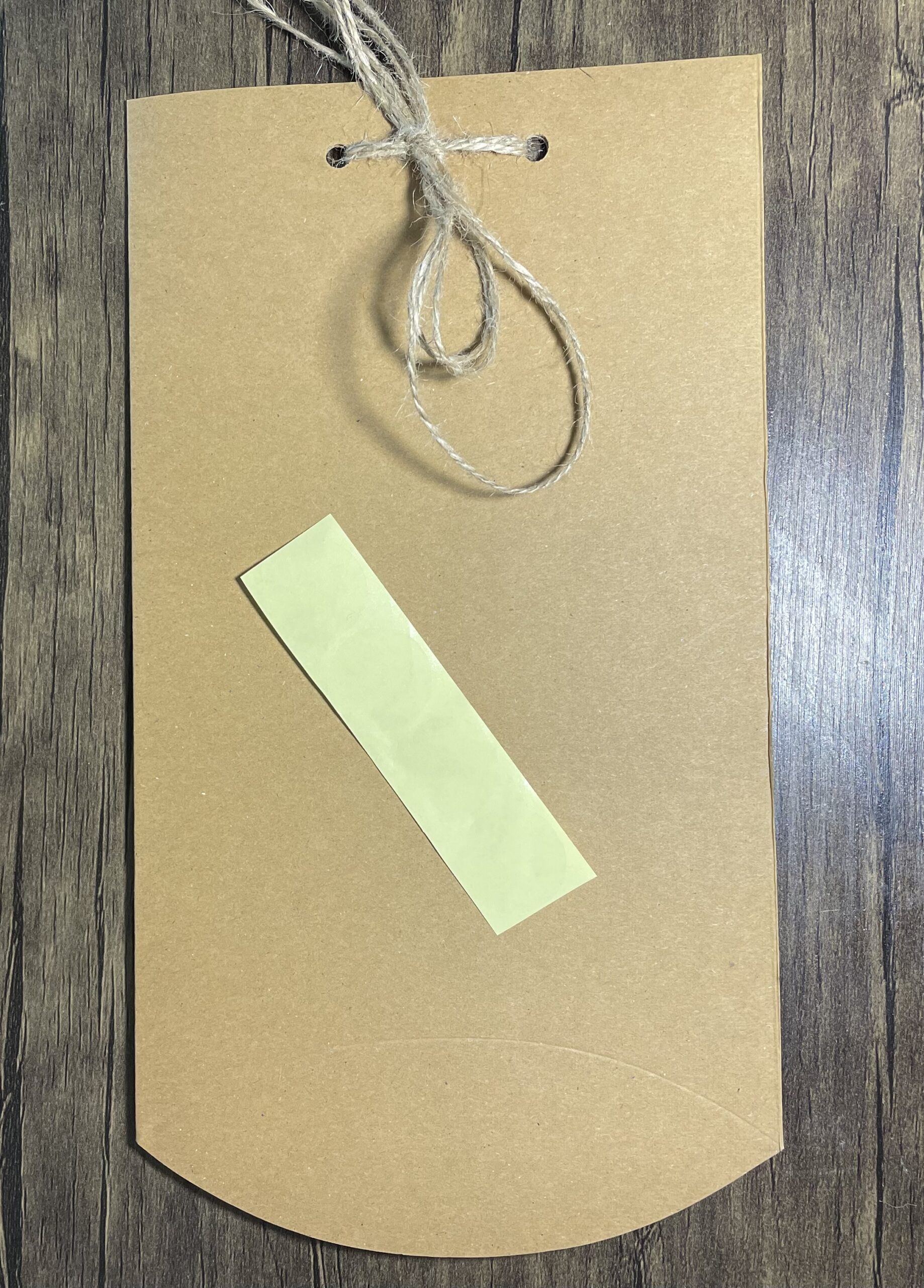 The envelope is craft brown and has one side tied with twine, the other side pops open and the flaps are held closed with 4 clear circle stickers.