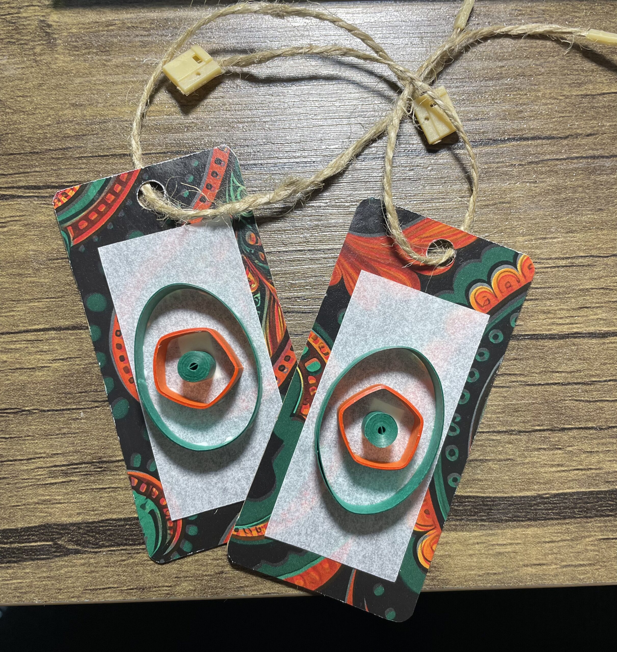 Teal and orange oval gift tags! I loved the paisley designed cardstock paper used for these tags! The teal and orange colors go so well with the background. I used 7mm quilling strips in the colors of orange and teal.